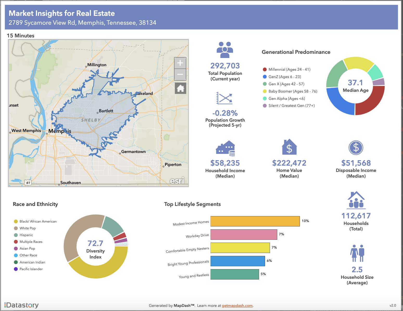 MapDash™ provides turnkey location intelligence to real estate developers looking for a data-driven competitive edge. From a robust data library with up-to-date and authoritative sources of demographic, environmental, local economic, and other key information, real estate professionals can easily add critical market context to a map. Simple to use location analysis tools enable deeper insight into what this data means for a particular real estate market opportunity, while infographic and report templates streamline communicating results with stakeholders. MapDash is specifically designed to allow real estate developers to harness the power of location intelligence without the heavy technical lift required by competing solutions.